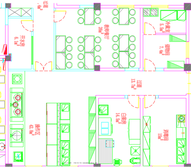 3、平面设计应满足操作流程、合理组织内部交通流线,避免生、熟食物的流线交叉。