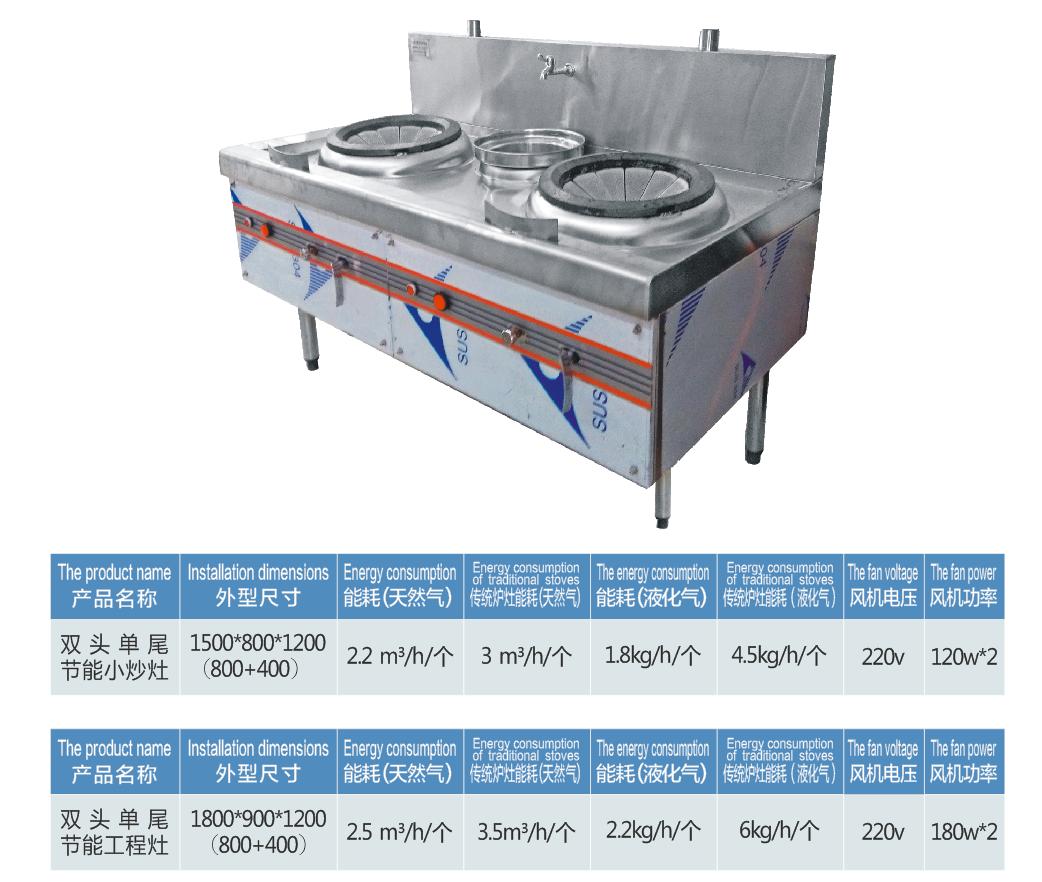 节能型双头单尾小炒灶 | 1500*800*1200(800+400) | 2.2*2 m³/h | 3*2 m³/h | 1.8*2kg/h | 4.5*2kg/h |